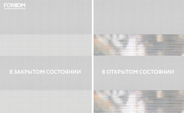 Полотно ткани, состоит из чередующихся горизонтальных полос – прозрачных и непрозрачных. Изменяя положение этих полос относительно друг другу, можно создать целых 3 режима регулировки светом. Например, чтобы в помещении стало светлее, нужно расположить прозрачные полосы друг напротив друга. Если разместить прозрачную и непрозрачную полосу параллельно друг другу, то можно добиться практически полного затемнения.